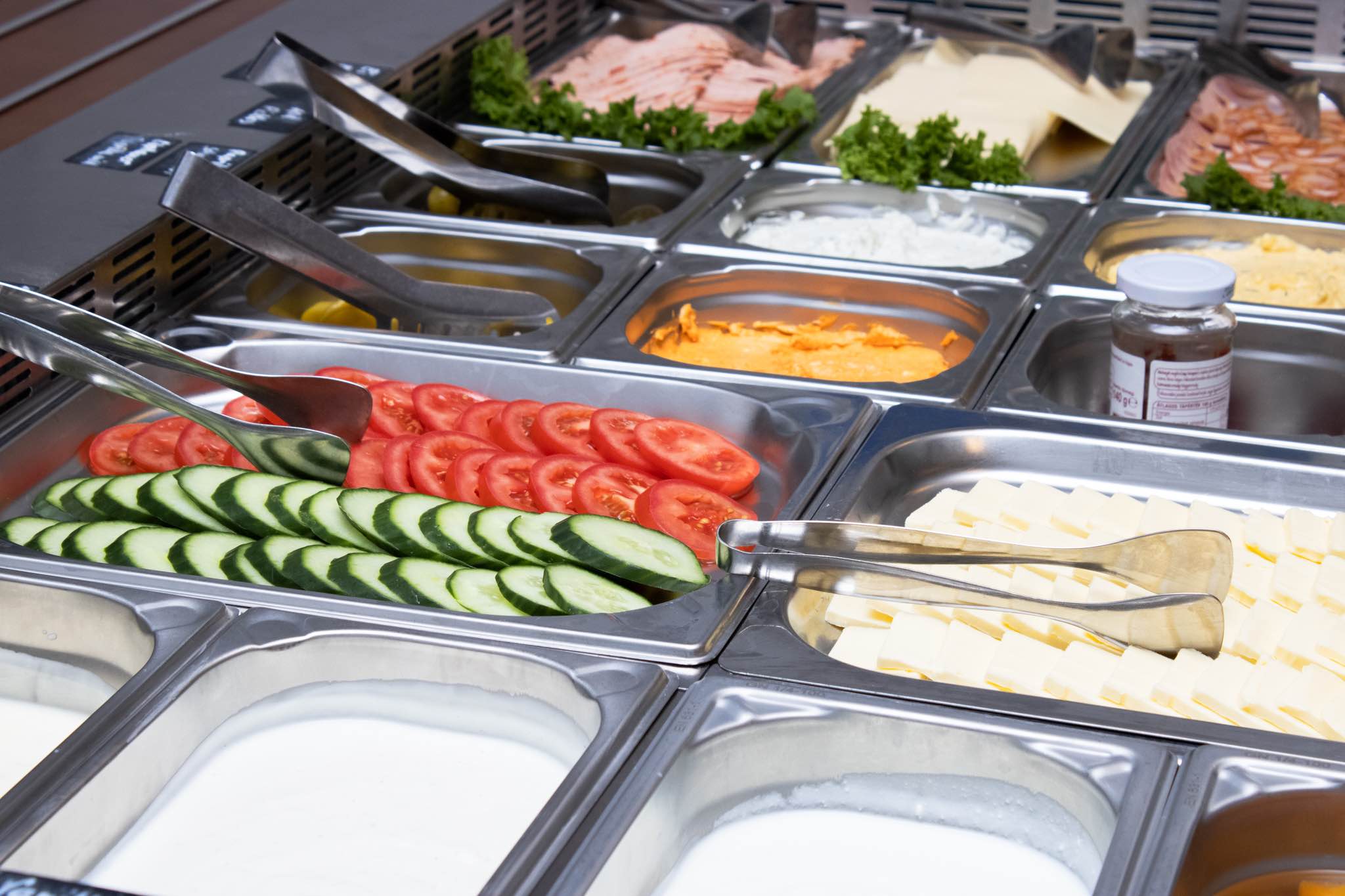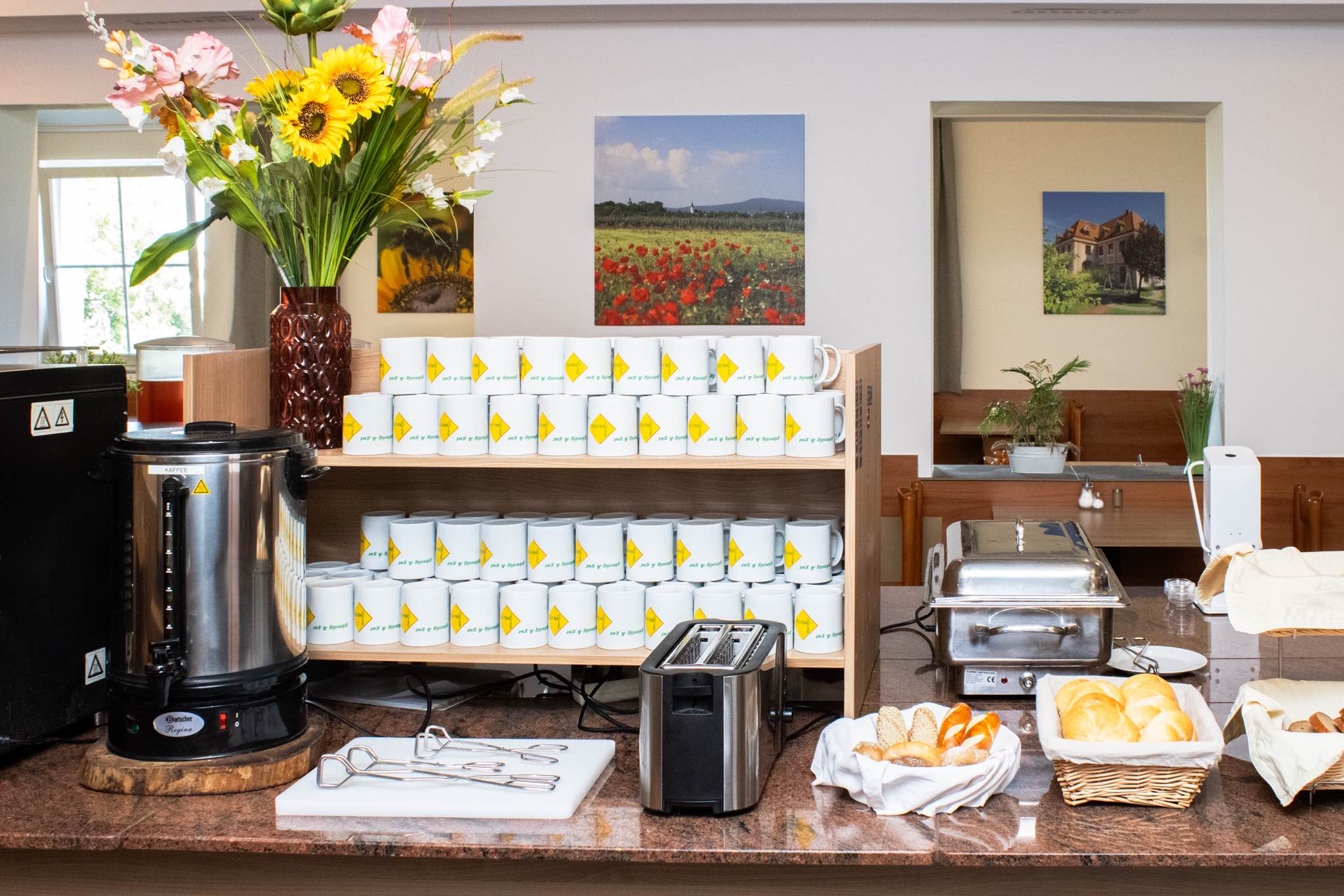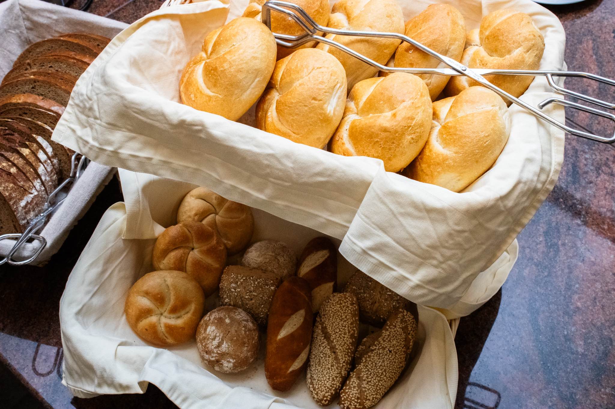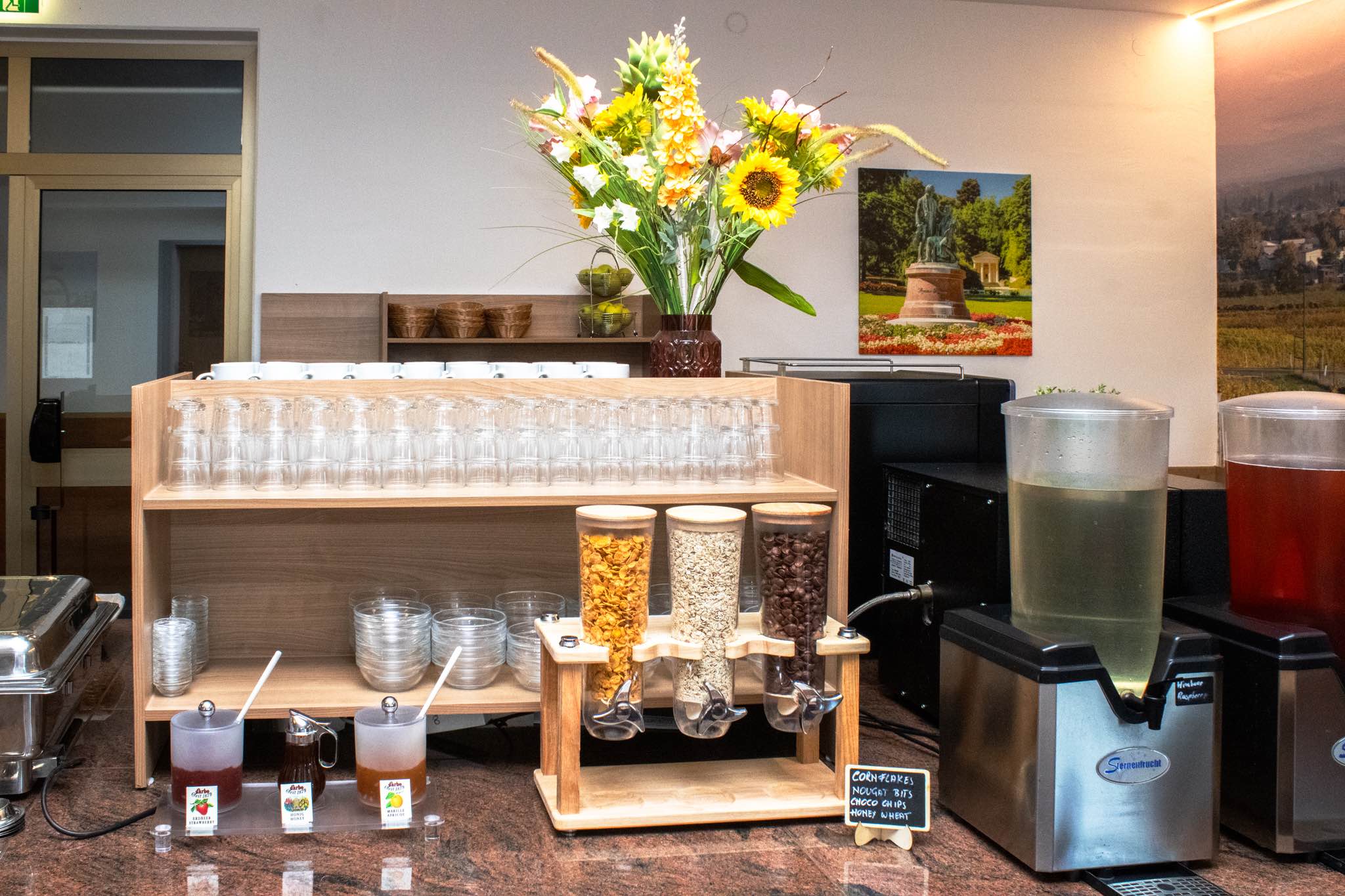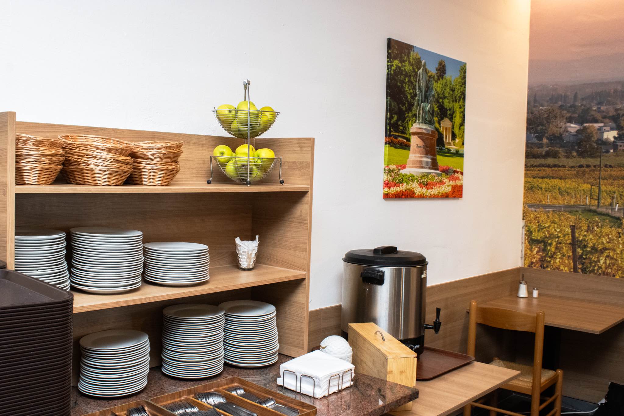 Die Parkplätze und das Frühstücksbuffet, das in einem schlichten Restaurant mit gemütlichen Tischen angeboten wird, sind im Preis inbegriffen.